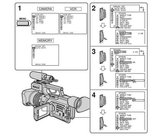 Изменение установок меню Чтобы изменить установки режимов в меню, необходимо выбрать соответствующие пункты меню (рис. 1П) с помощью дисковой ручки SEL/PUSH EXEC (Выбор/Нажать для исполнения). Установки по умолчанию можно изменять лишь частично. Вначале надо выбрать иконку, затем пункт меню, а после этого - режим. Изменение настроек осуществляется в следующей последовательности: 1.Нажать на кнопку MENU, когда камкордер работает в дежурном режиме, VCR (Видеомагнитофон) или 2.Повернуть дисковую ручку SEL/PUSH EXEC (Выбор/Нажать для исполнения) для выбора желаемой икон. 3.Повернуть ручку SEL/PUSH EXEC для выбора желаемого параметра, а затем нажать на ручку для выполнения этой установки. 4.Повернуть ручку SEL/PUSH EXEC для выбора желаемого режима, а затем нажать на ручку для выполнения этой установки. 5.Если необходимо изменить другие параметры, надо выбрать RETURN (Возврат) и нажать на дисковую ручку, а затем повторить пункты 2... 4. Дальнейшей инициацией соответствующих строк в иконках меню осуществляются установки режима для каждого параметра.