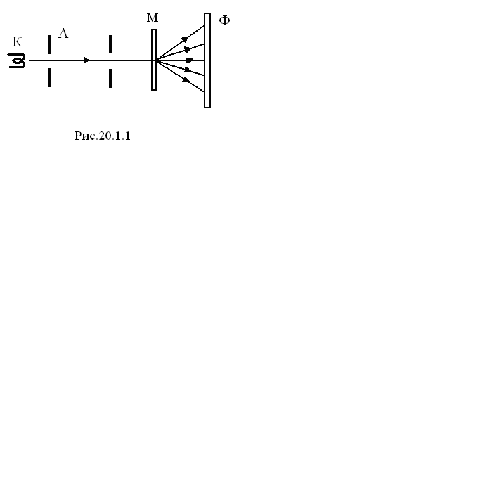 П. Тартаковский и Дж.П. Томсон независимо друг от друга наблюдали дифракцию пучка электронов на металлической фольге (рис 20.1.1). Из катода К вылетают электроны, которые фокусируются с помощью анода А, и проходят сквозь металлическую фольгу М толщиной 1 мкм. В результате на фотопластинке Ф получается дифракционная картина подобная дифракционной картине световых волн (рис.20.1.2).
