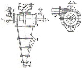 8- сурет. Сұрыптаушы гидроциклон 1- ағызынды сұғындырмасы; 2-ауыстырмалы; 3- цилиндр; 4- конустар; 5- сақиналы конус; 6- құм сұғындырмасы; 7- пульпа түсетін құбыр; 8- резиналы диафрагма; 9- бөлгіш камера; 10- манометр. Гидроциклонның ішкі беті мұжылмас үшін арнаулы футеровкалармен капталынады. Цилиндр бөлегінің беті ортасында тесігі бар қақпақпен жабылған. Осы тесікке ағызынды шығатын сұғындырма орнатылған. Конустың төменгі түбінде шөккен құм шығатын тесік бар. Оған алынып салынатын сұғындырма орнатылады. Аппараттың корпусы құйылып (шойыннан) немесе болат беттерінен пісіріліп жасалынған. Қазіргі кездерде гидроциклон конструкцияларында полимерлік материалдар қолданылады. Гидроциклонға пульпа насостың айдау қысымымен корпустың цилиндрлі бетіне жанама орнатылған (тангенциалды) құбыр арқылы түседі. Соның нәтижесінде пульпа айналмалы қозғалысқа келеді, ал ол ортадан тепкіш күшті пайда етеді. Ағызынды шығатын сұғындырма диаметрі құм шығатын сұғындырма диаметрінен көп үлкен. Сондықтан судың негізгі массасы ағызынды сұғындырмасы арқылы көтеріледі. Соның нәтижесінде көтерілу ағымы пайда болады. сонда гидроциклон ішіндегі пульпа құрамындағы әр түйіршікке үш күш әсер етеді: салмақ күші, ортадан тепкіш күш және жоғарғы ағым күші. Түйіршіктің ағызындыға не құмға кетуі үш күшке тең әсерлі күштің бағытына байланысты. Ірі және тығыздығы үлкен түйіршіктерге ортадан тепкіш күш пен салмақ күші әсер етеді де олар құмға түседі, ал ұсақтарына ағым күші басым әсер етеді де ағызындығы шығады. Сонымен, құмға не болмаса ағызындыға шығатын түйіршіктер ірілігін бірнеше факторларды өзгерту арқылы реттеуге болады. Оларға жататындар: гидроциклонға түсетін пульпаның қысымы, пульпаның тығыздығы, ағызынды және құм сұғындырмаларының диаметрлері. Іс жүзінде көбінде тек құмды сұғындырма диаметрі өзгертіледі. Оның диаметрі кішірейтілсе көтерілу ағын жылдамдығы өседі де ағызындыға шығатын түйіршіктер диаметрі үлкейеді және керісінше. Гидроциклондар байыту фабрикаларында сұрыптау мақсатымен қолданылатын ең көп тараған аппаратқа жатады. Олардың артықшылығы – диаметрімен биіктігі үлкен емес, сондықтан аз жер алады. Көбінде олар диірменнің кен түсер жағына жоғары биіктікке орнатылады. Диірменнен шыққан зат насоспен гидроциклонға айдалынады. Одан шыққан құм өздігінен ағып диірменге түседі де, ағызынды не келесі ұнтақтау сатысына, не байыту процесіне бағытталады. Олардың кемшіліктері – пульпаны белгілі қысыммен түсіру үшін насос қолданудың қажеттілігі. Соған сәйкес гидроциклондар жоғары және төмен қысымды болып екіге бөлінеді. Біріншілерінде, түсетін пульпа қысымы мөлшері 0,25-0,35 МПа болса, екіншілерінде ол 0,05-0,13 МПа-ға тең. Конусты гидроциклоннан басқа өндірісте батарейлі гидроциклондар және үш өнімді цилиндрлі гидроциклондар қолданылады. Біріншісі, үлкен өнімділікте сақтаумен өте майда түйіршікті ағызында алу максатымен қолданылады. Олардың бір-бірінен айырмашылығы батарейлі гидроциклонды құрастырудағы гидроциклондар санымен, размерлерімен, конструкцияларымен, компоновкасымен және жүктемелеу мен олардан заттарды шығару әдістерімен айқындалады. Үш өнімді цилиндрлі гидроциклондар екі цилиндрлі және конусты гидроциклондардан тұрады. Соңғы жылдарда өндірісте нақтылы қолданыс тапқан гидроциклон түрлері 9-суретте көрсетілген