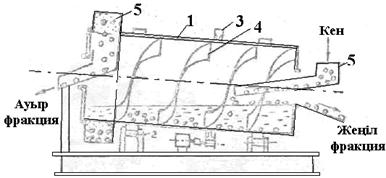 17-сурет. Доңғалақты ауыр орталы сепараторлардың схемалық көрінісі: 1-ванна; 2-доңғалақ элеватор; 3-құлақты ескіш Кен науашық аркылы суспензияға толған ваннаға (1) түседі. Қалқыған жеңіл фракция айналмалы құлақты ескіш (3) әсерімен ығыстырылып науашыққа түсіріледі. Қалқыған кесектердің ескіш орнаған ванна шетіне ығысуына бастапқы түсетін кеннің де әсері тиеді. Ванна түбіне шөккен кен кесектері ваннаның бір қабырғасына жабыстыра көлбеу орналасқан элеваторлы доңғалаққа (2) түседі. Оның құрылысы да барабанды сепаратордағы элеваторлы доңғалақтың құрылысындай. Элеватор ақырын айналып тұрады. Оны ячейкаларға бөлетін қабырғалары тесікті. Солар арқылы суспензия төмен ағып бөлініп, ваннаға қайтарылып отырады. Ячейка белгілі биіктікке көтерілгенде ондағы жатқан кесектер сырғып құлап доңғалақтың ортасына көлбеу орналасқан науашыққа түседі. Қазіргі кезде екі өнім (ауыр және жеңіл фракциялар) емес, үш өнім (концентрат, қалдық және екі аралық өнім) беретін доңғалақты сепараторларда (СТТ) қолданылады. Демек, екі өнімді екі бөлгіш бір агрегатта біріктірілген. Бұл сепараторлар көмір байытуда кеңінен тарауда. Бастапқы көмір алдымен тығыздығы төмен суспензияға түсіп жеңіл фракция (таза көмір концентраты) бөлінеді. Одан шыққан ауырлау фракция екінші секцияда тығыздығы жоғарылау суспензияға түсіп, одан ауыр фракция (қалдық ретінде), екі аралық өнім алынады. Ақырғы өнім қосымша ұсатылғанда кейін қайтадан байытуға түседі. Доңғалақты сепараторлар көбінде көмір байытуға қолданылады. Оның кесектігі 300 мм-ге дейін болса олар тиімді жұмыс істей алады. А у ы р о р т а л ы г и д р о ц и к л о н д а р (КГ, ГТ). Одардың конструкцияларының классификациялау мақсатымен қолданылатын гидроциклондардың конструкциясынан айырмашылығы жоқ, тек көлбеу орнатылады (200-тай). Бұл аппараттарда байытылатын кен түйіршіктерінің диаметрі 0,2-0,5мм-ге дейін темендеуі мүмкін. Бататын түйіршіктердің шөгу жылдамдығы ортадан тепкіш күш әсерімен арттырылады. Гидроциклонның орнатылу көрінісі 17-суретте келтірілген. Суспензия байытылатын кенмен бірге гидроцикклонның цилиндрлі бөлегіне (1) тангенциалды (жанама) орнатылған патрубок (2) арқылы түседі. Заттың қысымымен айналма қозғалысты траекториямен түсуінің нәтижесінде пайда болатын ортадан тепкіш күш әсерімен ауыр түйіршіктер және суспензойдтың біразы аппараттың ішкі қабырғасына ығыса төмен жылжып құмды патрубоктен (5) шығады. Жеңіл фракция және суспензияның негізгі бөлігі ағызынды патрубок (3) арқылы шығарылады. Гидроциклондардың жұмыс істеуіндегі ерекшеліктері сол түйіршіктердің шөгу жылдамдығы ондаған есе өседі, қозғалыс әсерімен суспензияның структурасы бұзылып оның тұтқырлық қасиеті үлесі белгілі мөлшерден артпайды. Осындай екі өнімді гидроциклондар қосақтандырыла бір агрегат түрінде жасалса, онда оларды ауыр орталы үш өнімді гидроциклондар деп атайды. Демек, концентрат және қалдықтан (ауыр және жеңіл фракциялар) басқа екі аралықты өнім алынады. Соның нәтижесінде ауыр және жеңіл фракциялардың тазалығы артады.