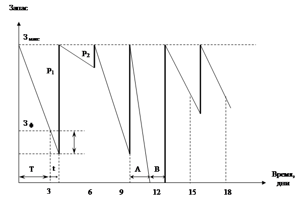 Условные обозначения: Т – интервал времени, через который повторяется заказ (в нашем случае – 3 дня) – для данной системы величина постоянная; t – время, необходимое на размещение и выполнение заказа (в приведенном примере – 1 день); Р1, Р2, …, Рi – величина отдельного, i-го заказа; З макс – предусмотренный нормой максимальный запас; З ф – фактический запас на момент проверки; З t – запас, расходуемый за время t, необходимое для размещения и выполнение заказа; А – период времени с интенсивным спросом; В – период времени с нулевым запасом. Интенсивность спроса, характеризуемая углом наклона участков линии, описывающей изменение запасов, в этой модели является величиной переменной (угол наклона различных участков ломаной - неодинаков). А поскольку заказ осуществляется через равные промежутки времени, то величина заказываемой партии в разных периодах также будет различна. Естественно, применять эту систему можно тогда, когда есть возможность заказывать партии, различные по величине (например, в случае применения контейнерной доставки заказываемого товара эта система не применима). Кроме того, систему не применяют, если доставка или размещение заказа обходится дорого. Например, если спрос за прошедший период был не значителен, то заказ также будет незначителен, что допустимо лишь при условии не существенности расходов, связанных с выполнением заказа. Особенностью описываемой системы является также и то, что она допускает возникновение дефицита. Как видно из графика, если спрос резко усилится (то есть график круто уйдет вниз - участок А), то запас закончится до наступления срока подачи заказа. Это означает, что система применима, когда возможные потери от дефицита для предприятия также несущественны. Подводя итог, отметим, что система контроля с фиксированной периодичность заказа применяется в следующих случаях: - условия поставки позволяют получать заказы различными по величине партиями; - расходы по размещению заказа и доставке сравнительно невелики; - потери от возможного дефицита сравнительно невелики. На практике по данной системе можно заказывать один из многих товаров, закупаемых у одного и того же поставщика, товары, на которые уровень спроса относительно постоянен, малоценные товары и т.д. В системе контроля за состоянием запасов с фиксированным размером заказа размер заказа на пополнение запаса является величиной постоянной. Интервалы времени, через которые производится размещение заказа, в этом случае могут быть разными (см. рис 5).