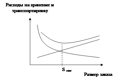 Рис. 8. Зависимость суммарных расходов на хранение и транспортировку от размера заказа. Оптимальный размер заказа – S опт [3, с. 195]