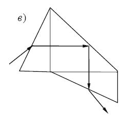 Рис. 2.1.7. Некоторые типы практически используемых призм. а) Призма Резерфорда, б) Призма прямого зрения, призма Амичи, в) Призма постоянного угла отклонения, призма Аббе.