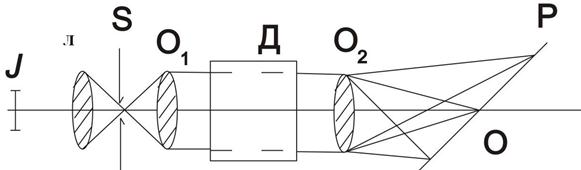 Источник излучения «J» через осветительную систему «Л» освещает узкую входную щель прибора «S» Фокусирующая оптика, состоящая из двух объективов «О1»(коллиматорный объектив) и «О2»(камерный объектив) с параллельным ходом лучей между ними в фокальной плоскости «Р» дает изображение щели «S». Разные направления лучей для различных длин волн осуществляются диспергирующей системой «Д». Совместно с диспергирующей системой фокусирующая система дает прерывную или непрерывную последовательность монохроматических изображений входной щели, называемую спектром. Характер спектра зависит от типа источника излучения. Монохроматоры служат для выделения одной спектральной линии, или участка сплошного излучения. Область спектра, для которой предназначены монохроматоры, определяет выбор материала для оптики. Для видимой области спектра наибольшее распространение получил универсальный монохроматор УМ–2 со стеклянной оптикой.