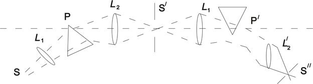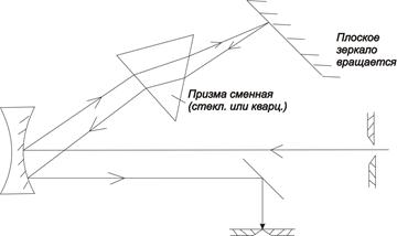 Здесь обе дисперсионные системы работают в одном направлении, за счет чего линейная дисперсия увеличивается в 2 раза. Изменение длины волны производится одновременным поворотом обоих призм прибора. Схема призменного монохроматора с зеркальной оптикой марки ЗМР-3