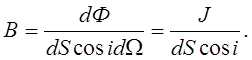 Коэффициент В носит название яркости источника в направлении, определяемом углом i. Интенсивность (яркость) светового потока L является характеристикой светового поля в случаях, когда сам источник не виден (например, яркость неба, когда солнце еще не взошло или закрыто облаками). Это есть величина светового потока, протекающего через единицу видимого сечения в направлении, определяемом углом i между направлением потока и нормалью к этому сечению, внутрь единичного телесного угла: