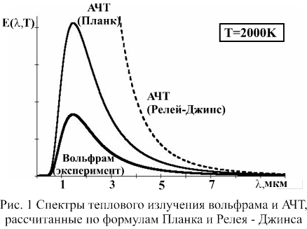 На рис. 1 показан типичный график функции Е(l,Т) вольфрама, нагретого до 2000К. Соответствующие кривые для тел из других материалов могут располагаться как выше, так и ниже кривой для вольфрама. Максимально возможной величиной излучательной способности среди различных тел, находящихся при одинаковых температурах, обладает так называемое абсолютно черное тело (АЧТ), график которого также представлен на рис. 1. Кроме этого АЧТ является единственным телом, которое полностью поглощает