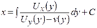 Поток жидкости, содержащей твердые частицы, движется в горизонтальном направлении (рис.4.5). Его течение характеризуется горизонтальной Ux(y) и вертикальной Uy(y) составляющими скорости. Частицы имеют скорость движения относительно жидкости v(y). Определим траектории движения частиц. За время dt частица в горизонтальном направлении пройдет путь, равный Решая эту систему уравнений, получаем: