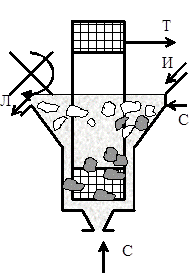 Рис. 6.8. Схемы сепараторов для обогащения в тяжелых суспензиях: И – исходный продукт; Л – легкий продукт; Т – тяжелый продукт. Разгрузка тяжелой фракции: а, б – аэролифтная; в – гидротранспортная; г-е, з-к, м, н – элеваторным колесом; ж – ковшовым элеватором; л – шнеком.