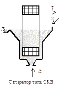 Рис. 6.7. Принципиальная схема сепаратора для обогащения в тяжелых средах В рабочий объем сепаратора, ограниченный его ванной поступает тяжелая суспензия заданной плотности. Ее подача осуществляется снизу (примерно 2/3 общего расхода) для создания восходящего потока для поддержания равномерной концентрации утяжелителя. Примерно 1/3 суспензии подается в верхнюю часть ванны со стороны подачи исходного продукта. Это необходимо для поддержания необходимой горизонтальной скорости течения суспензии в сторону сливного порога. Исходный продукт по наклонному щиту равномерно вводится в суспензию. Куски с плотностью, большей плотности суспензии, тонут и попадают в ковши элеваторного колеса, образованные перфорированными перегородками. При вращении колеса они поднимаются выше уровня суспензии. Захваченная суспензия стекает в ванну, а отделенный от нее тяжелый продукт выгружается при дальнейшем вращении колеса. Куски, плотностью, меньшей плотности суспензии, остаются в ее верхних слоях, а оказавшиеся при загрузке на определенной глубине – всплывают, формируя легкий продукт. Суспензия, подаваемая в сепаратор, вытекает из него через сливной порог, вынося легкий продукт за пределы сепаратора. Для облегчения преодоления сливного порога крупными кусками сепаратор имеет механическое гребковое устройство. Классификация тяжелосредных сепараторов приведена в табл. 6.2, а их схемы на рис. 6.8. В целом технологическая эффективность сепараторов убывает для аппаратов, представленных схемами от а к е и от ж к н, а эксплуатационные расходы возрастают соответственно в том же порядке. Для сепараторов, представленных схемами г, з-л эти показатели примерно одинаковы. В сепараторах с малой удельной производительностью благодаря значительному объему ванны плотность суспензии является более стабильной, но труднее поддается регулировке по сравнению с сепараторами со средней и большой удельной производительностью.