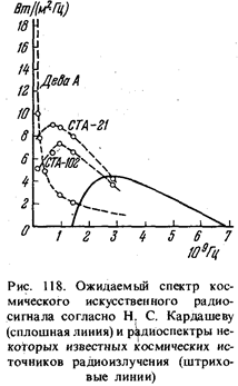 В предыдущей главе мы сформулировали понятие «космическое чудо» как наблюдаемое проявление деятельности высокоразвитой галактической или метагалактической цивилизации. Мы подходим к основному вопросу: наблюдаем ли мы во Вселенной такие «сверхъестественные» (т. е. не подчиняющиеся законам движения неживой материи) явления? На этот вопрос пока однозначно ответить нельзя. Тем более важно его поставить. Если окажется, что во всей наблюдаемой нами Вселенной никаких «чудес», могущих быть связанными с проявлениями разумной жизни в космическом масштабе, нет, это с большой вероятностью может означать, что нигде разумная жизнь не достигает достаточно высокою уровня развития. А между тем не видно причин, почему бы, неограниченно развиваясь, разумная жизнь не стала проявлять себя в общегалактическом масштабе. Как пример такого ожидаемого «чуда», мы рассмотрим сейчас интересную идею Н. С. Кардашева. Предположим, что высокоразвитая цивилизация, освоившая все межпланетное пространство (либо путем построения сферы Дайсона, либо путем сооружения огромного количества «эфирных городов», снабжаемых термоядерной энергией с использованием вещества больших планет), решила посылать сигналы связи к неизвестным ей инопланетным цивилизациям. Как мы уже подчеркивали в гл. 23 наиболее эффективным для этой цели был бы изотропный сигнал. В исследовании Дайсона предполагалось, что таким сигналом может быть инфракрасное излучение сферы, окружающей центральную звезду. Однако такой способ сигнализации далеко не самый экономичный. При данной мощности передатчика для посылки сигналов наиболее целесообразно использовать радиоволны. Они существенно увеличивают дальность связи по сравнению с инфракрасным излучением сферы Дайсона. В то же время они легко поддаются модуляции, что открывает почти неограниченные возможности передачи информации. Пусть цивилизация некоторую часть своих энергетических ресурсов решила использовать для установления контактов с инопланетными разумными существами. Предположим, что передаваемое излучение является почти изотропным. Заметим, что технически создать такой очень мощный и в то же время достаточно изотропный излучатель не просто. По-видимому, естественнее всего распределить огромное количество сравнительно небольших излучателей по всей планетной системе. Н. С. Кардашев, исходя из огромных расстояний, разделяющих инопланетные цивилизации, считает, что радиопередачи должны быть безответны. Такое «альтруистическое» поведение «сверхцивилизации» представляется ему вполне естественным, и с этим нельзя не согласиться. Ведь очень вероятно, что каждая из этих «сверхцивилизаций» в свое время «безвозмездно» получила ценнейшую информацию от своих более развитых космических соседей и тем самым взяла на себя, так сказать, «моральные обязательства» перед своими «младшими братьями» во Вселенной... Кардашев далее считает, что сигнал должен быть широкополосным и сразу же нести в себе огромное количество информации. Спектральная характеристика сигнала должна быть близка к спектральной характеристике космических и квантовых шумов (см. рис. 88), взятых с обратным знаком. При этом условии обеспечивается максимальная информативность сигнала. На рис. 118 приведен вероятный спектр такого искусственного источника. В со