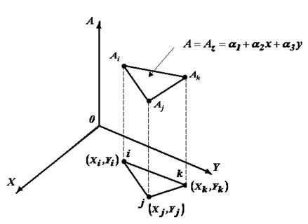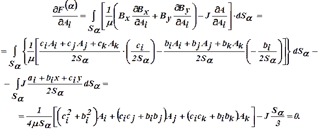 В этом выражении коэффициенты Постоянство градиента внутри каждого элемента означает, что необходимо использовать очень малые по величине конечные элементы, чтобы аппроксимировать быстро меняющуюся функцию Решение краевых задач теории поля методом конечных элементов производится на основе вариационного исчисления. С вариационной точки зрения решение дифференциального уравнения в частных производных с заданными граничными условиями эквивалентно нахождению минимума функционала, составленному из энергетических соотношений поля. Для плоскопараллельного магнитного поля постоянного задача решение уравнения Пуассона относительно векторного магнитного потенциала
