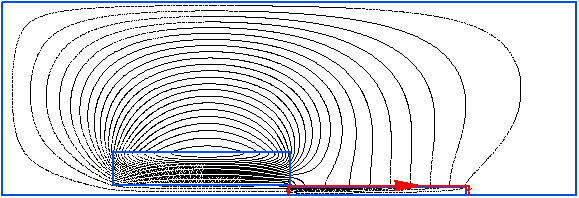 На картине магнитного поля сплошными линиями обозначены линии функции магнитного потока (силовые линии). Число силовых линий Задание контура интегрирования вблизи стального сердечника позволяет с помощью интегрального калькулятора ELCUT определить электромагнитную силу (тяговое усилие) · Глубина погружения стального сердечника внутрь катушки
