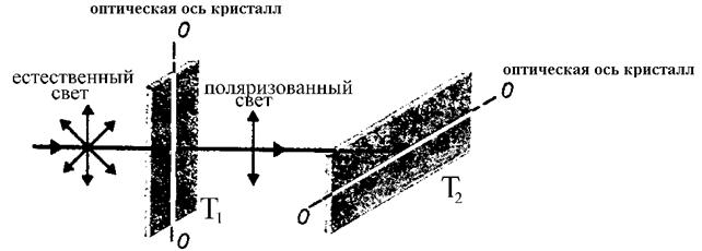 Свет, в котором вектор Естественный свет можно преобразовать в поляризованный, пропуская его через поляризаторы - вещества, пропускающие колебания вектора Обычно поляризаторами служат анизотропные кристаллы (наиболее известен турмалин). На рисунке представлен типичный опыт по получению поляризованного света: через кристалл турмалина Т1 пропускают естественный.