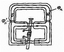 В настоящее время это наиболее совершенные поляризованные электромагниты. Якорь также находится под действием разности двух сил, направленных в разные стороны. При этом одна из сил определяется суммой, а другая – разностью двух потоков. Если в предыдущей схеме поляризующий магнитный поток проходит по тем же частям магнитопровода, что и поток рабочей обмотки, то в данной схеме пути этих потоков почти полностью разделены, они сходятся лишь в рабочих зазорах. Это создает условия для более стабильной работы постоянного магнита и позволяет повысить чувствительность электромагнита в целом. Магнитопровод управляющего потока выполняется шихтованным. Это делается для уменьшения времени срабатывания, уменьшается замедляющее действие вихревых токов при нарастании потока t сраб = 0,001-0,003 с. У поляризованных электромагнитов с параллельной системой и магнитной системой мостового типа электромеханической характеристики не имеют принципиальных отличий между собой.