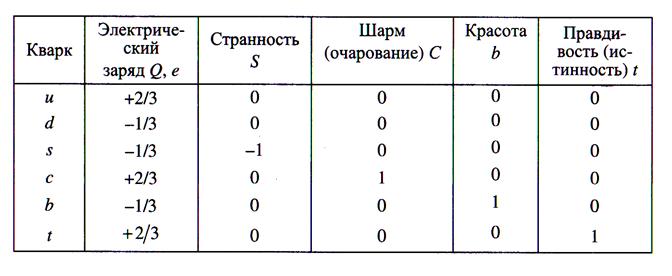 Все адроны построены из частиц, названных кварками. В настоящее время установлено, что существуют шесть типов кварков: u, d, s, c, b и t. Спин всех кварков равен ½ (кварки являются фермионами), а барионный заряд В = 1/3. Кроме странности S кварки обладают ещё такими квантовыми характеристиками как шарм (очарование) – С, красота (прелесть) – b, правдивость (истинность) – t