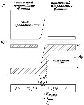 потенциалов Dj и создается диффузионный ток основных носителей Iо. В контактной области возникает внутреннее электрическое поле с напряженностью Е внутр , которое препятствует переходу всех основных носителей через границу (отсюда название «запирающий слой»). Неосновные носители, оказавшиеся вблизи границы, под действием этого поля проходят через запирающий слой, создавая небольшой ток неосновных носителей I н/о (дрейфовый ток). Если к системе не приложено внешнее электрическое поле, эти токи равны, текут в противоположных направлениях, поэтому результирующий ток равен нулю. Если к системе приложить внешнее электрическое поле (подключить к батарее), то в зависимости от полярности, ток через систему будет проходить или