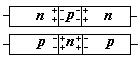 Если привести в контакт два вещества с разным типом проводимости, то в месте контакта образуется узкая зона, которая называется р-n -переходом или запирающим слоем. [xxvi] Ширина Dх этой зоны для полупроводников порядка 10-5 - 10-4 см, для металлов порядка 10-8 см. Рассмотрим пример соединения двух примесных полупроводников р - и n – типа, используя зонную схему. Соединение представляет собой единую систему, следовательно, уровень Ферми, который является кинетической энергией электронов, должен быть единым. Ранее были приведены зонные схемы примесных полупроводников. Если их сместить по вертикали так, чтобы уровень Ферми был единым, получим схему, показанную на рисунке ниже В полупроводнике n - типа имеется множество основных носителей (электронов) и значительно меньшее количество неосновных носителей (дырок). У р- типа - множество основных носителей (дырок) и существенно меньше неосновных (электронов). В нижней части рисунка большими кружками обозначены основные носители, малыми – неосновные [xxvii]. За счет теплового движения основные носители диффундируют (хаотически перемещаются), встречаются на границе контакта и рекомбинируют. Поэтому граница n -типа заряжается положительно, а граница р- типа - отрицательно. При этом количество носителей не уменьшается, т.к. одновременно происходит обратный процесс – генерация носителей за счет теплового возбуждения.. При динамическом равновесии в месте контакта возникает постоянная разность