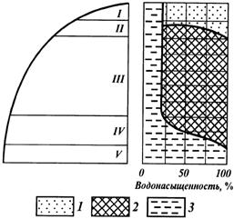 Рис. 14. Типичное размещение нефти, газа и воды в пласте (по М.И. Максимову): I — газовая шапка; II — зона перехода от нефти к газу; III - нефтяная часть; IV — зона перехода от нефти к воде; V — водоносная зона. 1 — газ; 2 — нефть; 3 - вода