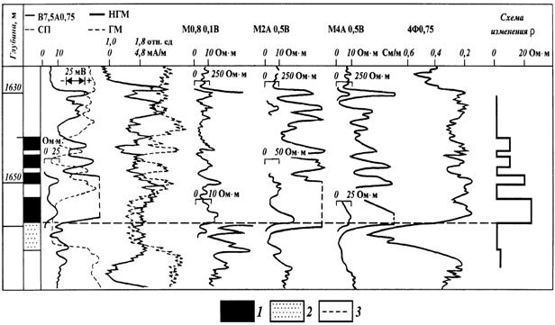 Рис. 15. Пример обоснования положения границ в переходной зоне. Зависимости коэффициентов: 1 — водонасыщенности kв и 2 - нефтенасыщенности kн от высоты над уровнем нулевого капиллярного давления р; 3 - относительной проницаемости от kв и kн; I - подошва переходной зоны; II - кровля переходной зоны; III - уровень появления подвижной нефти; IV — уровень перехода воды в неподвижное состояние; Н — расстояние до поверхности со 100%-ным водонасыщением Кривые 3, 4 на рис. 15 характеризуют зависимость фазовой проницаемости в переходной зоне от насыщенности нефтью и водой. По фазовой проницаемости переходную зону можно разделить на три части. В нижней части переходной зоны фазовая проницаемость коллекторов для нефти равна нулю, и лишь по достижении определенного значения kн нефть способна двигаться по пористой среде. Этому значению kн соответствует уровень III, ниже которого в переходной зоне подвижной является только вода. Выше уровня III в средней части переходной зоны подвижностью обладают как вода, так и нефть, причем постепенно фазовая проницаемость для нефти возрастает, а для воды снижается. По достижении определенного критического значения kв фазовая проницаемость для воды становится равной нулю. Этому значению kв соответствует уровень IV, выше которого может перемещаться только нефть. В настоящее время нет единого подхода к выбору поверхности принимаемой за ВНК в одних случаях за ВНК принимают уровень IV. Так проводят ВНК при изучении формы залежей нефти в кварцевых коллекторах Урало-Поволжья, где толщина переходной зоны 5-8 м. Расстояние между IV уровнем и подошвой переходной зоны здесь равно 1 -1,4 м. Поэтому количество подвижной нефти ниже уровня IV невелико и его не учитывают в запасах. В других случаях за ВНК принимают уровень III. Так проводят ВНК по залежам в полимиктовых коллекторах нефтяных месторождений Западной Сибири, где толщина переходной зоны достигает 10-15 м и более. Здесь толщина слоя между III и IV уровнем иногда 6–10 м и количество подвижной нефти в нем столь значительно, что пренебрегать им нельзя. В некоторых случаях, когда толщина переходной зоны незначительна (до 1–1,5м), за ВНК принимают наиболее четко фиксируемую на геофизических диаграммах поверхность, соответствующую I уровню, т.е. подошве переходной зоны. Таким образом, на практике в качестве поверхности ВНК принимается одна из рассмотренных граничных поверхностей переходной зоны. Эту поверхность выбирают исходя из толщины переходной зоны в целом и отдельных ее частей. Информацией о положении ВНК, ГНК, ГВК в каждой отдельной скважине служат данные керна, промысловой геофизики и опробования. По керну установить положение контакта в скважине можно при незначительной толщине переходной зоны, полном выносе керна и четком фиксировании положения контакта в керне по внешним признакам. Основную информацию о положении контактов получают методами промысловой геофизики. Нижняя граница переходной зоны обычно четко фиксируется резким скачкообразным уменьшением величины рг на диаграммах электрометрии (рис. 16) и снижением показаний нейтронного гамма-метода. При необходимости дополнительно привлекаются данные нейтрон-нейтронных методов по тепловым нейтронам, импульсных методов, наведенной активности по натрию и хлору. Таким образом, в случаях, когда толщина переходной зоны невел