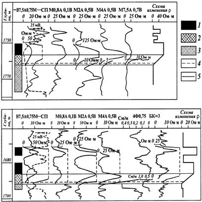 Рис. 17. Определение границ переходной зоны и ВНК по данным электрометрии в разных скважинах (по Б. М. Орлинскому) Коллекторы- 1 - предельно нефтенасыщенный, 2 - переходной зоны, 3 -водонасыщенный; границы: 4 –ВНК, 5 - переходной зоны