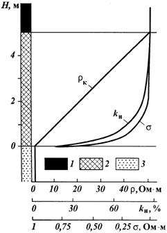 Рис. 18. Графики изменения нефтенасыщенности к„, удельного сопротивления рК и электрической проводимости а в переходной зоне (по Б.М. Орлинскому). Коллекторы: 1 - предельно нефтенасыщенный, 2- переходной зоны, 3 - водонасыщенный; q - расстояние до поверхности со 100 %-ным водонасыщением