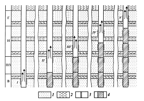 Рис. 19. Схема поинтервального опробования скважин Г, Н, П/3, В - интервалы разреза охарактеризованные по геофизическим данным соответственно как газонасыщенный нефтенасыщенный переходная зона от нефти к воде водонасыщенный- I, II, III, IV, V - последовательные интервалы опробования; 1 - пласты-коллекторы, 2 - непроницаемые разделы между пластами-коллекторами, 3 - интервалы перфорации, 4 - цементные стаканы устанавливаемые в стволе скважины после опробования каждого интервала