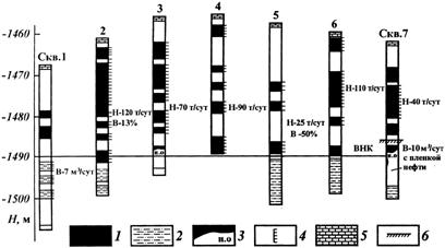 При опробовании переходной водонефтяной зоны из ее верхней части должна быть получена чистая нефть, из средней части - нефть с водой и из нижней - вода. Поверхности ВНК, ГНК и ГВК могут представлять собой плоскости, горизонтальные или наклонные, но могут иметь и более сложную форму, находясь на отдельных участках залежи выше или ниже среднего положения. Форма контакта зависит от величины напора и направления движения пластовых вод, неоднородности продуктивных пластов и других факторов. По залежам в малоактивных водонапорных системах, приуроченным к относительно однородным пластам, поверхности ГВК, ГНК и ВНК обычно представляют собой горизонтальную плоскость. Поверхность контакта в пределах залежи считается горизонтальной, если разность абсолютных отметок ее в отдельных точках (скважинах) не больше удвоенной средней квадратической погрешности определения. Для глубин залежей до 2000 м эта погрешность в среднем составляет ± 2,0 м. При значительном напоре подземных вод поверхность контакта может быть наклонена в сторону области разгрузки. Наклон может достигать 5—10 м и более на крупных залежах с обширными водонефтяными зонами. При значительной литологической изменчивости продуктивных пластов на участках с ухудшенной коллекторской характеристикой в результате повышенного действия капиллярных сил ВНК часто находится несколько выше. В результате поверхность ВНК приобретает усложненную форму. Для обоснования положения ВНК по залежи строят схему (рис. 20) на основе комплексного обобщения имеющихся данных и опробования разведочными и первоочередными добывающими скважинами. Для этого подбирают скважины, дающие информацию о начальном положении контакта. Обычно это скважины, расположенные в водонефтяной (газонефтяной, газоводяной) части залежи, а также в продуктивной и водяной частях пласта в непосредственной близости от контакта. В соответствии с гипсометрическим положением изучаемой части разреза на схему наносят колонку каждой скважины с указанием на ней интервалов проницаемых пластов. На каждой колонке помещают информацию для обоснования положения ВНК: данные промысловой геофизики и исследования керна о характере насыщенности пород-коллекторов, интервалы перфорации, дату и результаты опробования перфорированных интервалов (дебит нефти, газа и воды; депрессия на пласт; положение искусственных забоев после изоляции опробованных интервалов).