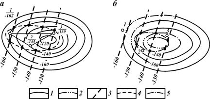 Рис. 20. Пример схемы обоснования положения ВНК. Терригенные пласты-коллекторы, выделенные по ГИС: 1 - нефтенасыщенные, 2 — водонасыщенные, 3 — с неопределенной насыщенностью; 4 — интервалы перфорации; 5 - “верхний известняк"; б - искусственный забой после опробования нижнего интервала; притоки: Н — нефти; В — воды На основании нанесенной на схему информации проводят линию, отвечающую среднему положению контакта. Если в отдельных скважинах данные о характере насыщенности пласта (прослоя) не соответствуют принимаемому по большинству скважин положению контакта, необходимо выяснить причины этого. На рис. 20 линия, соответствующая наиболее вероятному положению ВНК, проходит по отметке -1490 м. В большинстве скважин выше этой отметки проницаемые пласты и прослои по геофизическим данным нефтенасыщены и из продуктивных интервалов получен приток нефти. Ниже этой отметки во всех скважинах, кроме скв. 2, пласты, по данным ГИС, водонасыщены. Несовпадение данных ГИС в скв. 2 с принятым положением ВНК связано с неточностью определения характера насыщения нижнего перфорированного пласта методами геофизики. Об этом свидетельствуют результаты опробования этой скважины. Получение вместе с нефтью 15 % воды указывает на то, что скв. 2 ВНК проходит в нижнем перфорированном интервале. Выше принимаемой отметки ВНК обводненная нефть получена в скв. 5. В данном случае это может быть связано с некачественным цементированием заколонного пространства. Аналогично обосновывают положение ГВК и ГНК. При наклонном положении или сложной форме контакта для его пространственного изображения строят карту поверхности контакта в изолиниях. Для этого используют принятые по комплексу всех данных отметки контакта по каждой скважине. Значения абсолютных отметок контакта в каждой скважине наносят на план расположения скважин и путем линейной интерполяции определяют положение изогипс поверхности контакта. Линии пересечения ВНК, ГВК или ГНК с поверхностями пласта-коллектора являются контурами нефтеносности (газоносности), ограничивающими по площади размеры залежи и ее зон с равным характером нефтегазоводонасыщения. Применительно к каждому контакту различают внешний и внутренний контуры. Внешний контур — линия пересечения контакта с верхней поверхностью пласта, внутренний — с нижней поверхностью. Во внутреннем контуре находится чисто нефтяная (газовая) часть пласта. Внешний контур является границей залежи. Между внешним и внутренним контурами располагается водонефтяная (водогазовая, газонефтяная) часть. Соответственно положение внешнего контура находят на карте верхней, а внутреннего — на карте нижней поверхности пласта. При горизонтальном контакте на карте контур проводят по изогипсе, соответствующей гипсометрическому положению контакта или параллельно изогипсе с близким значением. При горизонтальном контакте линия контура не может пересекать изогипсы. При наклонном положении контакта, если диапазон изменения его абсолютных отметок больше принятого сечения изогипс, линии контуров пересекают изогипсы карт поверхностей пласта. В этом случае положение контуров определяется с помощью метода схождения (рис. 21). Для этого совмещают карту поверхности пласта и карту поверхности контакта, построенные с одинаковым сечением изогипс. Линия контура прово