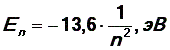 Уравнение (10) определяет разрешенные значения энергии электрона в атоме водорода. Число n принимает целые значения n = 1,2,3, …¥. Таким образом, энергия электрона в атоме водорода может иметь не любые значения, а только дискретный набор значений, определяемых числом n, или, как говорят, энергия электрона квантуется. Подставляя значения массы и заряда электрона, постоянных