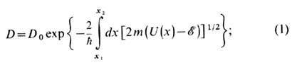 Здесь r 1,2-радиальные точки поворота, подынтегральное выражение в к-рых равно нулю. Множитель w0 зависит от характера движения в классически разрешённой части потенциала, напр. он пропорц. классич. частоте колебаний частицы между стенками барьера. Т. э. позволяет понять механизм a-распада тяжёлых ядер. Между