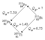 In this cycle, energies from two of the alpha decays and one beta decay are measurable. The unmeasured beta-decay energy for bismuth-211, Q β−(Bi), is readily calculated because conservation of energy requires the sum of Q values around the cycle to be zero. Thus, Q β−(Bi) + 7.59 − 1.43 − 6.75 = 0. Solving this equation gives Q β−(Bi) = 0.59 MeV. This calculation by closed energy cycles can be extended from stable lead-207 back up the chain of alpha and beta decays to its natural precursor uranium-235 and beyond. In this manner the nuclear binding energies of a series of nuclei can be linked together. Because alpha decay decreases the mass number A by 4, and beta decay does not change A, closed α−β-cycle calculations based on lead-207 can link up only those nuclei with mass numbers of the general type A = 4 n + 3, in which n is an integer. Another, the 4 n series, has as its natural precursor thorium-232 and its stable end product lead-208. Another, the 4 n + 2 series, has uranium-238 as its natural precursor and lead-206 as its end product. In early research on natural radioactivity, the classification of isotopes into the series cited above was of great significance because they were identified and studied as families. Newly discovered radioactivities were given symbols relating them to the family and order of occurrence therein. Thus, thorium-234 was known as U X 1, the isomers of protactinium-234 as U X 2 and U Z, uranium-234 as UII, and so forth. These original symbols and names are occasionally encountered in more recent literature but are mainly of historical interest. The remaining 4 n + 1 series is not naturally occurring but comprises well-known artificial activities decaying down to stable thallium-205. To extend the knowledge of nuclear binding energies, it is clearly necessary to make measurements to supplement the radioactive-decay energy cycles. In part, this extension can be made by measurement of Q values of artificial nuclear reactions. For example, the neutron-binding energies of the lead isotopes needed to link the energies of the four radioactive families together can be measured by determining the threshold gamma-ray energy to remove a neutron (photonuclear reaction); or the energies of incoming deuteron and outgoing proton in the reaction can be measured to provide this information. Further extensions of nuclear-binding-energy measurements rely on precision mass spectroscopy. By ionizing, accelerating, and magnetically deflecting various nuclides, their masses can be measured with great precision. A precise measurement of the masses of atoms involved in radioactive decay is equivalent to direct measurement of the energy release in the decay process. The atomic mass of naturally occurring but radioactive potassium-40 is measured to be 39.964008 amu. Potassium-40 decays predominantly by β-emission to calcium-40, having a measured mass 39.962589. Through Einstein's equation, energy is equal to mass (m) times velocity of light (c) squared, or E = mc 2, the energy release (Q) and the mass difference, Δ m, are related, the conversion factor being one amu, equal to 931.478 MeV. Thus, the excess mass of potassium-40 over calcium-40 appears as the total energy release Q β in the radioactive decay Q β− = (39.964008 − 39.962589) × 931.478 MeV = 1.31 MeV. The other neighbouring isobar (same mass number, different atomic number) to argon-40 is also of lower mass, 39.962384, than potassium-40. This mass difference converted to energy units gives an energy release of 1.5 MeV, this being the energy release for EC decay to argon-40. The maximum energy release for positron emission is always less than that for electron capture by twice the rest mass energy of an electron (2 m 0 c 2 = 1.022 MeV); thus, the maximum positron energy for this reaction is 1.5 − 1.02, or 0.48 MeV. To connect alpha-decay energies and nuclear mass differences requires a precise knowledge of the alpha-particle (helium-4) atomic mass. The mass of the parent minus the sum of the masses of the decay products gives the energy release. Thus, for alpha decay of plutonium-239 to uranium-235 and helium-4 the calculation goes as follows: