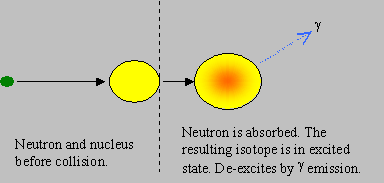 Capture: The neutron is absorbed by the target nucleus to form the next higher isotope (of mass A+1), in an excited state of energy. The new isotope de-excites by emitting g rays. The neutron is thus lost in this reaction. This is often known as ‘radiative capture’.