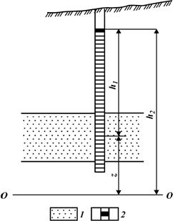 Рис. 44. Пьезометрические высота и напор в скважине: 1 - пласт-коллектор; 2 -пьезометрический уровень в скважине; О-О - условная плоскость; h1 - пьезометрическая высота; z — расстояние от середины пласта до условной плоскости; h2 — пьезометрический напор жидкости в скважине ρ, при необходимости всегда можно перейти от абсолютного пластового давления к приведенному (и наоборот):