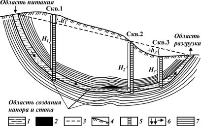 Рис. 45. Схема инфильтрационной водонапорной системы: 1 — водонасыщенный пласт-коллектор; 2 — залежь нефти; 3 — пьезометрическая поверхность; 4 — земная поверхность; 5 — скважина со столбом пластовой воды, уравновешивающим начальное пластовое давление; 6 — направление движения жидкости; 7 — водоупорные породы Скважины с устьями ниже пьезометрической поверхности (рис. 45, скв. 3) будут фонтанировать. Пластовое давление в таких скважинах можно определить, замерив манометром давление ру на их герметизированных устьях: