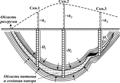 В связи со сложностью рельефа земной поверхности устья скважин, пробуренных в разных точках на водоносный пласт, обладающий давлением, могут быть выше, ниже и на уровне пьезометрической поверхности. Это можно видеть на примере водонапорной системы, показанной на рис. 45. В скважинах с устьями выше пьезометрической поверхности (скв. 1) абсолютное пластовое давление можно определить, зная глубину скважины Н 1 до середины пласта и глубину пьезометрического уровня h1 от устья скважины, а также плотность воды ρв (она обычно больше единицы вследствие того, что пластовые воды минерализованы):