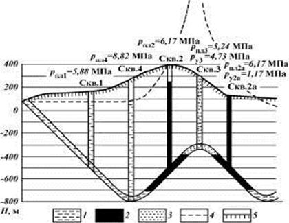 Рис. 46. Схема элизионной водонапорной системы. Условные обозначения см. на рис. 45 В зависимости от степени соответствия начального пластового давления глубине залегания пластов-коллекторов выделяют две группы залежей УВ: Ø залежи с начальным пластовым давлением, соответствующим гидростатическому давлению; Ø залежи с начальным пластовым давлением, отличающимся от гидростатического. В геолого-промысловой практике принято называть залежи первого вида залежами с нормальным пластовым давлением, второго вида — залежами с аномальным пластовым давлением. Подобное разделение следует считать условным, так как любое значение начального пластового давления связано с геологическими особенностями района и для рассматриваемых геологических условий является нормальным. Залежи с начальным пластовым давлением, соответствующим гидростатическому. Гидростатическим пластовым давлением (ГПД) называют давление в пласте-коллекторе, возникающее под действием гидростатической нагрузки вод, перемещающихся по этому пласту в сторону его регионального погружения. В водоносном пласте начальное пластовое давление считают равным гидростатическому, когда соответствующая ему пьезометрическая высота в каждой его точке примерно соответствует глубине залегания пласта. Пластовое давление, близкое к гидростатическому, характерно для инфильтрационных водонапорных систем и приуроченных к ним залежей (см. рис. 45). Инфильтрационную систему отличают следующие особенности. Она является “открытой”, т.е. сообщается с земной поверхностью в областях как разгрузки, так и питания. Область питания системы расположена гипсометрически выше области разгрузки. Природный резервуар пополняется атмосферными и поверхностными водами. Движение жидкости в пласте-коллекторе происходит в основном в соответствии с влиянием гравитационных сил в сторону регионального погружения пластов. Пьезометрическая поверхность системы условно (в предположении, что пласты содержат пресную воду плотностью 1 г/см3) представляется в виде наклонной плоскости, соединяющей области питания и разгрузки. Фактически вследствие изменчивости плотности пластовых вод в системе (обычно в пределах 1-1,25 г/см3) она имеет несколько более сложный характер. За пределами залежей нефти и газа, т.е. в основной по площади водоносной части инфильтрационных систем, значение вертикального градиента пластового давления обычно не выходит за пределы 0,008 — 0,013 МПа/м и в среднем составляет около 0,01 МПа/м. Редкие исключения могут быть обусловлены весьма резким различием абсолютных отметок устьев скважин и пьезометрической поверхности. В инфильтрационных водонапорных системах начальное пластовое давление возрастает практически пропорционально увеличению глубины залегания водоносных пластов-коллекторов. Его значения всегда намного ниже значений геостатического давления, т.е. давления на пласт массы вышележащей толщи пород. Это иллюстрируется рис. 47. Инфильтрационные водонапорные системы наиболее характерны для древних платформ. В пределах нефтегазовых залежей значения начального пластового давления и статических уровней превышают значения этих показателей в водоносной части пласта при тех же абсолютных отметках залегания пластов. Величина превышения зависит от степени различий плотности 