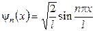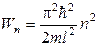 ψ''+ ω2ψ = 0. Решение такого уравнения имеет вид: Ψ(х) = А sin(ωx+ α). (9.7) Из условия Ψ(0) = 0 получаем Ψ(0) = А sinα= 0, откуда следует, что α должна быть равна нулю. Далее должно выполняться условие: Ψ(l) = А sinωl= 0, что возможно лишь в случае, если ωl= ± nπ (n= 1, 2, 3, …). (9.8) Из уравнений (9.6) и (9.8) найдем собственные значения энергии частицы: Спектр энергии оказался дискретным. На рис. 9.2б изображена схема энергетических уровней. Оценим расстояние между соседними уровнями для различных значений массы частицы mи ширины ямы l. Разность энергии двух соседних уровней равна Если взять m порядка массы электрона (9,1∙ 10-31 кг), а l порядка 0,1 м (электрон в сосуде), получим Подставив в (9.7) значение ω, найдем собственные функции задачи: