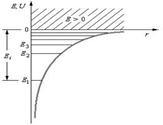 Рис. 6 Состояние электрона в атоме водорода описывается волновой функцией Ψ, удовлетворяющей стационарному уравнению Шредингера, учитывающему значение (1):' где m – масса электрона, Е – полная энергия электрона в атоме. Это так называемое стационарное уравнение Шрёдингера для электрона водородоподобного атома ВДПА. 1. Энергия. В теории дифференциальных уравнений доказывается, что уравнения типа (2) имеют решения, удовлетворяющие требованиям однозначности, конечности и непрерывности волновой функции Ψ, только при собственных значениях энергии Таким образом, как и в случае «потенциальной ямы» с бесконечно высокими «стенками», решение уравнения Шредингера для атома водорода приводит к появлению дискретных энергетических уровней. Возможные значения Е1, Е2, Е3,... показаны па рис. 6 в виде горизонтальных прямых. Самый нижний уровень Е1, отвечающий минимальной возможной энергии, – основной, все остальные (Еn>E1, n = 2, 3,…) – возбужденные. При Е < 0 движение электрона является связанным он находится внутри гиперболической «потенциальной ямы». Из рисунка следует, что по мере роста главного квантового числа п энергетические уровни располагаются теснее и при п=∞ Е∞= 0. При Е > 0 движение электрона является свободным; область непрерывного спектра Е >0 (заштрихована на рис. 6) соответствует ионизованному атому. Энергия ионизации атома водорода равна Ei = - E1 = me4 / (8h2ε02) = 13,55 эВ. 2. Квантовые числа. В квантовой механике доказывается, что уравнению Шредингера (2) удовлетворяют собственные функции Главное квантовое число n, согласно (3), определяет энергетические уровни электрона в атоме и может принимать любые целочисленные значения, начиная с единицы: n =1, 2. 3,.... Date: 2015-05-19; view: 567; Нарушение авторских прав |