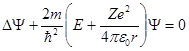 На основании своих исследований Резерфорд в 1911 г. предложил ядерную (планетарную) модель атома. Согласно этой модели вокруг положительного ядра по замкнутым орбитам движутся электроны, образуя электронную оболочку атома, в области с линейными размерами порядка 10-10 м. Заряд ядра равен Zе (Z. - порядковый номер элемента в системе Менделеева, е —.элементарный заряд), размер 10-15 – 10-14 м, масса, практически равна массе атома. Так как атомы нейтральны, то заряд ядра равен суммарному заряду электронов, т. е. вокруг ядра должно вращаться Zэлектронов. Атом водорода и водородоподобные системы – это системы, состоящие из ядра с зарядом Ze и одного электрона (например, ионы He+, Li2+). Решение задачи об энергетических уровнях электрона для атома водорода (а также водородоподобных систем: иона гелия Не+, двукратно ионизованного лития Li+ + и др.) сводится к задаче о движении электрона в кулоновском поле ядра. Потенциальная энергия взаимодействия электрона с ядром, обладающим зарядом Zе (для атома водорода Z =1),