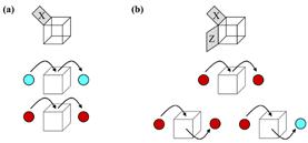 Рис. 1 Классический и квантовый бит. (a) Классический бит: если мы положим бит в классический ящик, то цвет вынутого шарика будет такой же, как у того, который мы туда поместили. (b) Кубит: если мы положим шарик в квантовый ящик и откроем неверную дверь, то цвет шарика выберется случайным образом.