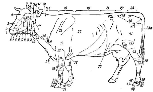 Рис. 78. Деление тела млекопитающих на области и звенья. Области головы: / — верхней губы; 2 — ноздрей; 3 — носовая; 4 — лобная; 5 — затылочная; 6 — нижней губы; 7 — подбородочная; 8 — щечная; 9 — подчелюстная; 10 — подглазничная; 11 — жевательной мышцы; 12 — век; 13 — височная; 14 — теменная; 15 — околоушная; 16 — ушной раковины; 17 — гортанная; области шеи (18а) и туловища; 18 — выйная; 19 — холка; 20 — спина; 21 — поясница; 22 — крестец; 23 — корень хвоста; 23а — хвост; 24 — плечеголовной мышцы; 25 — нижняя шейная; 26 — трахеальная; 27 — предгрудинная; 28—грудинная; 29 — реберная (боковая грудная); 30 — живот; 31 — ягодичная; 22, 23, 31 — круп; звенья грудной конечности: 32 — область плечевого пояса (область лопатки); 33 — плечо; 34 — предплечье; 35 — запястье; 36 — пясть; 37 — проксимальная фаланга пальца (путо); 38 — средняя фаланга пальца; 39 — диета льна я фаланга пальца (снаружи копыто); 35, 36, 37, 38, 39—кисть; 37, 38, 39 —палец грудной конечности; звенья тазовой конечности: 40 — тазовый пояс; 41 — бедро; 42 — область коленной чашки; 43— голень; 44 — заплюсна; 45 — плюсна; 46 — проксимальная фаланга пальцев; 47 — средняя фаланга пальцев; 48 — дистальная фаланга пальца (снаружи копыто); 44, 45, 46, 47, 48 — стопа; 46, 47, 48 — палец тазовой конечности; суставы: 49 — челюстной; 50 — затылочно-шейный; 51 — плечевой; 52 — локтевой; 53 — запястный; 54 — проксимальной фаланги пальцев (пуховый); 55— средней фаланги (венечный); 56—дистальной фаланги (копытный); 57 — тазобедренный; 57а — маклок; 576 — подвздошный гребень; 58 — коленный; 59 — заплюсневый (скакательный); 60 — проксимальной фаланги (путовый); 61 — средней фаланги (венечный); 62 — дистальной фаланги (копытный). Голова (лат. — caput, греч. — kephale). Костный остов ее — череп (cranium) делится на мозговой (место, где располагается головной мозг) и лицевой отделы (остов ротовой и носовой полостей). В мозговом отделе различают области: затылочную (рис. 78—5), теменную (14), лобную (4), височную (13), околоушную (15) и области ушной раковины (16). На лицевом отделе головы выделяют носовую область, или нос (3), с областью ноздрей (2), области верхней (1) и нижней (6) губ, подглазничную (10), щечную (8) и область жевательной мышцы (11), подбородочную (7) и подчелюстную (9). Остовом всех перечисленных областей являются большей частью одноименные кости того или другого отдела черепа, частично хрящевые образования и некоторые мягкие органы (рис. 79). Шея — cervix s. collum (рис. 78—18,а) — делится на верхнюю шейную область (18), области плечеголовной мышцы (24) и нижнюю шейную область (25), на которой различают гортанную (17) и трахеальную области (26)~ Костную основу шеи составляют шейные позвонки (рис. 79—3). Туловище состоит из отделов: грудного, брюшного и тазового. Грудной отдел содержит спину и грудь, его часто называют спинно-грудным (рио. 78—19, 20, 27, 28, 29). Он расположен между шеей (18а) и поясницей (21)*Костный остов его составляют, сверху — грудные, или спинные, позвонки— vertebrae thoracales (рис. 79—4), с боков — ребра (5) и снизу — грудная кость, (6, 7, 8). Все вместе они составляют грудную клетку. Верхняя часть спинно-грудного отдела — спина (рис. 78—20). Передняя ее часть, у копытных более высокая и изогнутая, выделяется под названием колка (19). Костным остовом ее являются первые грудные позвонки с их более длинными остистыми отростками (рис. 79—4). Остальные грудные позвонки у копытных составляют остов задней части спины, которая бывает ниже холки и более прямолиней