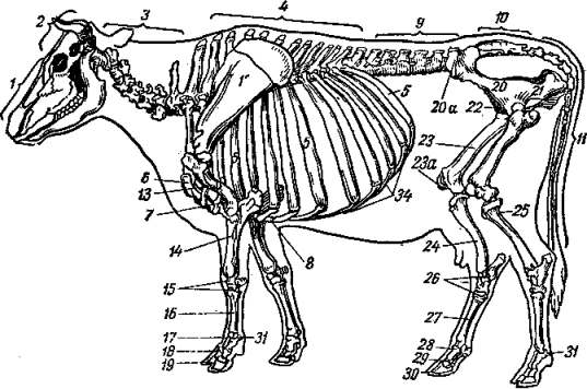 Рис. 79. Деление скелета коровы на отделы и звенья. Череп: / — лицевой отдел черепа; 2 — мозговой отдел черепа; кости туловища; 3 —«шейные позвонки; 4 — грудные (спинные) позвонки; 5 — ребра; 6 — рукоятка грудной кости; 7 — тело грудной кости; 8 — мечевидный хрящ; 4, 5, 6,7,8 — грудная клетка; 6, 7, 8 — грудная кость (грудина); 9 — поясничные позвонки; 10 — крестцовая кость; 11 — хвостовые позвонки; 3, 4, 9, 10, 11 — позвоночный столб; кости грудной конечности: 12 — лопатка; 13 — плечевая кость; 14 — кости предплечья; 15 — кости запястья; 16 — кости пясти; 17 — кости проксимальной фаланги пальцев (путовые); 18 — кости средней фаланги пальцев (венечные); 19 — кости дистальной фаланги пальцев (копытные); 15—19 — кости кисти; 17, 18, 19 — кости пальцев; кости тазовой конечности: 20 — подвздошная; 20а — маклок; 21 — седалищная; 22 — лонная; 20—22 — кости тазового пояса; 23 — бедренная кость; 23а — коленная чашка; 24 — большеберцовая; 25 — малоберцовая; 24—25 — кости голени; 26 — кости заплюсны; 27 — кости плюсны; 28 — кости проксимальной фаланги пальцев (путовые кости); 29 — кости средней фаланги пальцев (венечные кости); 30 — кости дистальной фаланги пальцев (копытные); 26—30 — кости стопы; 28—30 — кости пальцев; 31 — сезамовидные кости проксимальной фаланги; 34 —• реберная дуга. Конечности. У наземных животных различают передние, или грудные, и задние, или тазовые, конечности (рис. 78). Они состоят из плечевого (32) и тазового поясов (40), которыми соединяются со стволовой частью туловища, и свободных конечностей. Свободные конечности делятся на основной поддерживающий столб, удерживающий стволовую часть тела животного над землей, и кисть (на грудной конечности) (35—39), или стопу (44—48) (на тазовой конечности); последними низшие позвоночные и некоторые млекопитающие непосредственно опираются о почву. Основной поддерживающий столб состоит из двух звеньев. Верхнее звено его на грудной конечности — плечо (33), а на тазовой — бедро (41), нижнее — предплечье на грудной конечности (34) и голень на тазовой (431. Грудная конечность называется так потому, что соединяется плечевым поясом с грудной клеткой. Костный остов области плечевого пояса (32) у низших позвоночных состоит из трех костей: лопатки, ключицы и коракоидной. У копытных животных, конечности которых приспособлены только для поступательного движения, костный остов плечевого пояса представлен одной лопаткой (рис, 79—12). У домашних млекопитающих неполно развитая ключица встречается только у животных, обладающих разнообразными движениями грудной конечности, например у кошек. Коракоидная кость у большинства млекопитающих редуцирована до небольшого остатка, сросшегося с нижним концом лопатки,— коракоидного отростка. Поэтому область плечевого пояса у сельскохозяйственных животных называют просто областью лопатки. Плечо — brachium (рис. 78—33) — расположено ниже плечевого пояса и имеет форму неправильного треугольника, обращенного основанием вниз, а вершиной к задневерхнему углу лопатки. Костный остов плеча — плечевая кость — os brachii (рис. 79—13). У копытных плечо не вполне свободное, так как расположено на наружной боковой поверхности грудной области и покрыто вместе с последней одним общим пластом кожи. Предплечье — antebrachium — у всех животных расположено свободно, вне кожного туловищного мешка (рис. 78—34). Основа его — две кости предплечья: лучевая — radius и локте