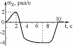 8.5. Диск радиуса R начинает вращаться из состояния покоя в горизонтальной плоскости вокруг оси Z, проходящей перпендикулярно его плоскости через его центр. Зависимость проекции угловой скорости от времени показана на графике. Чему равны тангенциальные ускорения точки на краю диска в моменты времени t1 = 2 с и t2 = 7 с?