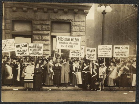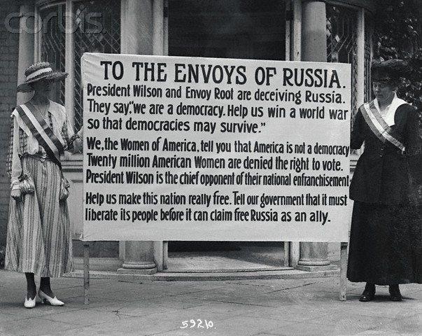 Демонстрация суфражисток адресованная американскому президенту (1913-1921) Вудро Вильсону, не только подписавшему закон о создании ФСР, но и находившемуся под плотной опекой «банкирской мафии» — «полковника» Менделя Хауса и Бернарда Баруха сотоварищи.