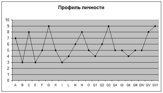 Опросник «Шестнадцать личностных факторов» (О. «Ш. л. ф.») (Sixteen Рersonality Factor Questionnaire, 16 PF) - принадлежит к числу наиболее распространенных личностных опросников. Впервые опубликован Р. Кэттеллом в 1950 г., последнее переработанное руководство вышло в 1970 г. Данный опросник предназначен для измерения 16 факторов личности и является реализацией подхода к ее исследованию на основе черт. Возможно применение опросника как в индивидуальном порядке, так и при групповом обследовании.[6] Опросник диагностирует черты личности, которые Р. Кэттелл называет конституционными факторами: фактор А – «замкнутость – общительность»; В – «интеллект»; С – «эмоциональная устойчивость»; Е – «доминантность – подчиненность»; F – «экспрессивность»; G – «нормативность поведения»; Н – «смелость»; I – «чувствительность»; L – «подозрительность – доверчивость»; М – «практичность»; N – «дипломатичность»; О – «уверенность в себе»; Q1 – «консерватизм»; Q2 – «конформизм»; Q3 – «самоконтроль»; Q4 – «напряженность»; MD – «адекватность самооценки». В настоящее время разработаны две основные эквивалентные формы опросника (А и В, причем А считается стандартной формой) по 187 вопросов в каждой (для обследования взрослых людей с образованием не ниже чем 8-9 классов). В обеих формах опросника по 3 «буферных» вопроса и от 20 до 26 вопросов, относящихся к каждому из измеряемых факторов. Обследуемому предлагают занести в регистрационный бланк один из вариантов ответа на вопрос: «да», «нет», «не знаю» (или «а», «в», «с»); при этом его предупреждают о том, чтобы ответов «не знаю» было как можно меньше. Полученные результаты выражаются и шкале стэнов с минимальным значением в 0 баллов, максимальным — 10 и средним 5,5 балла. Строится «профиль» личности, при интерпретации которого руководствуются степенью выраженности каждого фактора, особенностями их взаимодействия, а также нормативными данными (см. рис. 5).