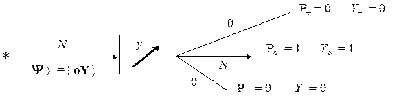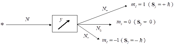 В этом случае мы можем утверждать, что наблюдаемая Sz имеет строго определенную величину (Sz = 0), а функция распределения Y(z) имеет ширину, равную нулю (m z = 0). Теперь измерим другую проекцию, например Sy. В процессе измерения частицы исходного пучка распределятся по трем базисным пучкам прибора ШГ y -типа, причем ни одна из вероятностей (амплитуд) не будет равна 0.