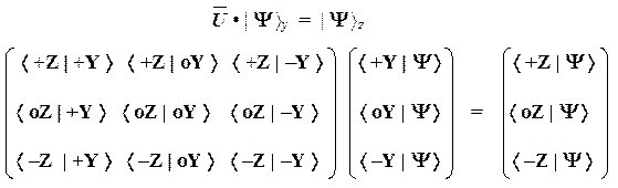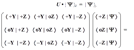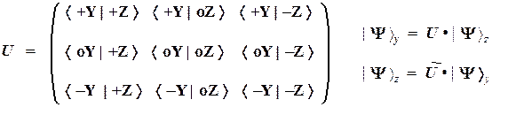 Исследовав результаты анализа, мы сможем представить вектор в виде ЛК трех базисных состояний: | Y ñ = Y + | +Y ñ + Y о| оY ñ + Y –| –Y ñ, где | Y + | 2 = P + ; | Y o | 2 = P o ; | Y – | 2 = P – . Таким образом, в данном базисе вектор состояния может быть изображен набором трех чисел | Y ñ = (Y +, Y о, Y –), где числа-координаты представляют собой амплитуды попадания частицы, находящейся в начальном состоянии | Y ñ, в один из базисных пучков: Y + = á +Y | Y ñ Y о = á oY | Y ñ Y – = á –Y | Y ñ Заметим, что базисные состояния теперь другие, они отличаются от прежних. В новых базисных состояниях определенное значение имеет проекция вектора спина не на ось z, а на ось y. Соответственно, тот же самый вектор задается другими числами-координатами. Другие значения будут иметь и вероятности P i. | Y ñ = Z + | +Z ñ + Z о| оZ ñ + Z –| –Z ñ = (Z + Z о Z –) | Y ñ = Y + | +Y ñ + Y о| оY ñ + Y –| –Y ñ = (Y + Y о Y –) Таким образом, мы получили два различных координатных представления одного и того же вектора состояния. Достаточно очевидно, что аналогичных представлений мы можем получить сколько угодно — для этого достаточно, например, ориентировать прибор ШГ в каком-то промежуточном направлении между осями y и z. Любые два представления будут взаимосвязаны между собой некоторым унитарным оператором U, который выглядит так: