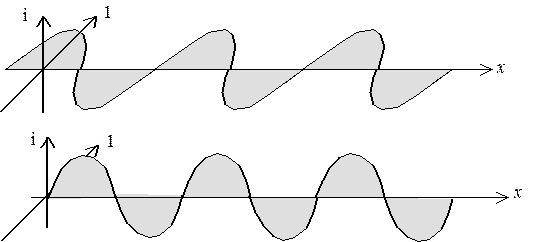 из которых ясно видно, что одна из функций (Рх) бесконечно широкая, а другая (РРх) — бесконечно узкая. Такая связь между двумя наблюдаемыми является проявлением важного КМ-принципа — принципа неопределенности (Гейзенберг). Сами наблюдаемые, связанные в отношении их определенности, называются совместно неизмеримыми (несоизмеримыми, сопряженными). Как во всяком ЛВП, в двумерном пространстве стационарных функций с определенным значением энергии можно выбрать не один базис, а бесконечно много таких базисов: y(х) = A • y + + B • y – = С • y ' + D • y '' =..... Рассмотрим еще один базис, состоящий из двух следующих функций: y ' = А (е i kx + e –i kx ) (А = В) y '' = А (е i kx – e –i kx ) (А = – В) Ввиду равенства модулей коэффициентов (А 2 = В 2), формулы для этих двух функций могут быть преобразованы с использованием тригонометрического представления комплексных экспонент: exp (±i • q) = cosq ± i • sinq. Тогда получим одну чисто действительную функцию и одну чисто мнимую функцию: y ' = 2 А • cos (kx) y ' = 2 iА • sin (kx) Графики этих функций имеют вид не спиралей, как в предыдущем случае, а вид плоских кривых — косинусоиды, лежащей в плоскости, образованной осью х и осью действительных чисел, и синусоиды, лежащей в плоскости, образованной осью х и осью мнимых чисел: