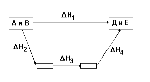 Изменение энтальпии реакции можно определить как экспериментально, так и с помощью расчетов с использованием энтальпий образования веществ, участвующих в химической реакции, с использованием закона, установленного русским ученым Гессом в 1840 году: Изменение энтальпии реакции, т.е. тепловой эффект реакции не зависит от пути ее протекания, а зависит только от начального и конечного состояния веществ, участвующих в реакции. Закон Гесса выполняется только для изохорно-изотермических процессов (Т = const, V = const) и изобарно-изотермических процессов (Т= const, р = const). Закона Гесса можно пояснить с помощью следующего примера: из исходных веществ А и В можно получить конечные продукты Д и Е двумя путями: 1 путь – сразу по одной реакции из А и В получаются продукты Д и Е, причем тепловой эффект этой реакции равен DН1; 2 путь – вещества Д и Е получаются из А и В в несколько реакций, тепловые эффекты которых равны DН2, DН3 и DН4. Закон Гесса утверждает, что тепловые эффекты будут связаны таким соотношением: DНр = DН2 + DН3 + DН4